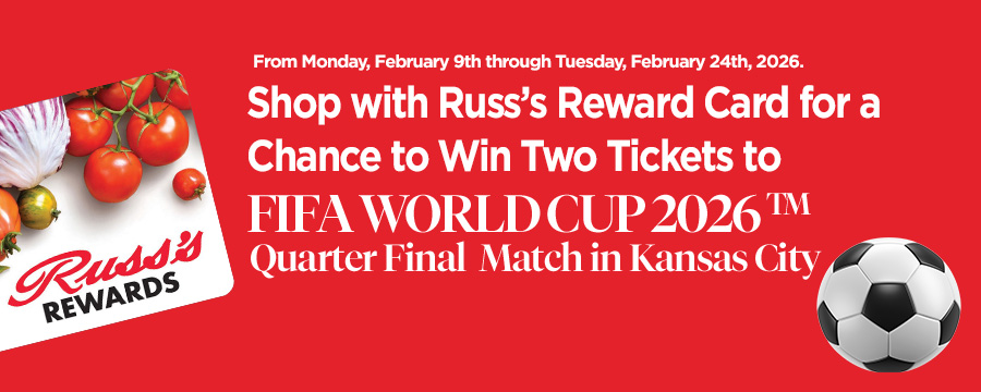 From Monday, February 9th through February 24th, 2026, Russ’s Market customers may enter for a chance to win two (2) tickets to the FIFA 2026 World Cup™ Match 87, taking place July 3rd, 2026 at 8:30 PM at GEHA Field at Arrowhead Stadium, Kansas City, Missouri.