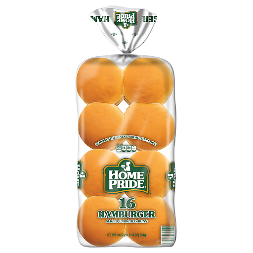 Home Pride® Enriched Hamburger Buns are versatile and delicious, making them the perfect burger buns for camping, grilling, graduation parties and more. Each package conveniently includes 16 fluffy Home Pride Hamburger Buns so that you can feed your family and guests with ease. Plus, these white bread sandwich rolls are soft yet sturdy enough to hold up well under whatever toppings you add. The next time you get ready to fire up the grill with burgers and boneless chicken breast, be sure you are well stocked with Home Pride Hamburger Buns. If ground beef isn't your preference, try these hamburger buns with your favorite veggie burger and toppings, or fried chicken patty with delicious buffalo sauce.