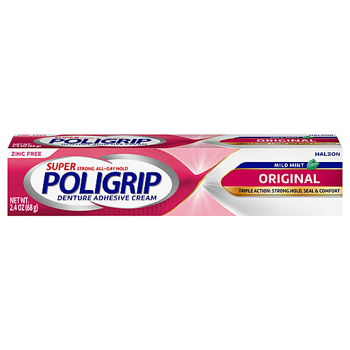 Finally, an effective way to keep dentures in place, all day long. Super Poligrip Original Denture Adhesive Cream offers a strong 12-hour hold that seals out up to 74% more food particles.* Its zinc-free formula is specially designed to give you a natural feel, so you can seal and protect with confidence throughout the day. Plus, all Super Poligrip Denture Adhesive products help prevent gum irritation by keeping out food particles, giving you comfort you can count on with every use.