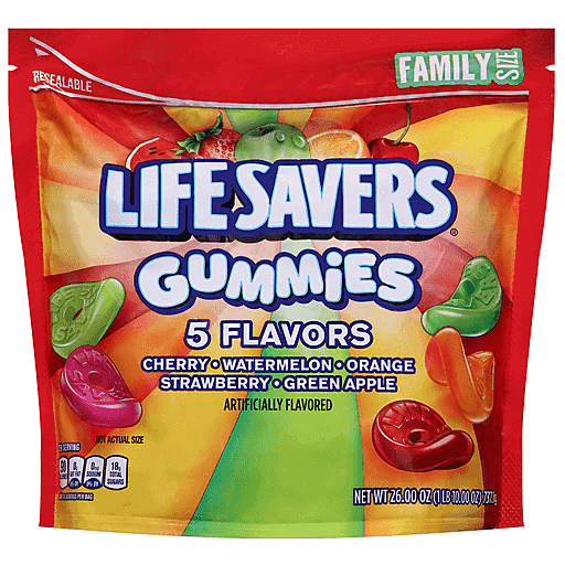 Who could resist the simple joy of the soft, chewy, fruity goodness of LIFE SAVERS Gummies Candy? Who would want to? The classic combination of cherry, watermelon, green apple, strawberry, and orange flavors in LIFE SAVERS 5 Flavors Gummies recalls the treats we enjoyed growing up. From offices So give yourself a moment to feel like a kid again with LIFE SAVERS Gummies candy: A Hole Lot O Fun. The possibilities are endless with this party size bag filled with delicious, fruity LIFE SAVERS Hard Candy. Keep some LIFE SAVERS Gummies Candy in your desk for an afternoon treat or top off candy buffets with these fruit-flavored candies.
