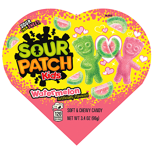 SOUR PATCH KIDS Watermelon Soft & Chewy Valentines Day Candy makes it easy to show your sweetie some love. This heart shaped box contains sour candies with watermelon flavor for a blast to your taste buds. Each piece is shaped like a watermelon slice to add excitement to your snacking. This sour candy is perfect for handing out at Valentine's Day parties or holiday celebrations. Keep this SOUR THEN SWEET candy on hand for a quick sour treat for Valentine’s Day. A fun alternative to bagged candy, these SOUR PATCH KIDS sour gummy snacks come in a heart shaped box that's ready to give as a Valentines Day gift.